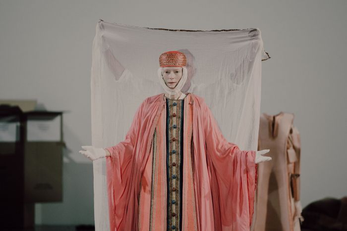 Minimalistyczna przestrzeń spektaklu potęguje jednocześnie prostotę rytuału i jego ceremonialność: neutralne tło i precyzyjne światło pozwala na lepszą ekspozycję kostiumów. W duecie z Tildą Swinton materiały, kolory, faktury i wspomnienia, także ładunki emocjonalne, które ze sobą niosą, stają się częścią „żywego muzeum”.